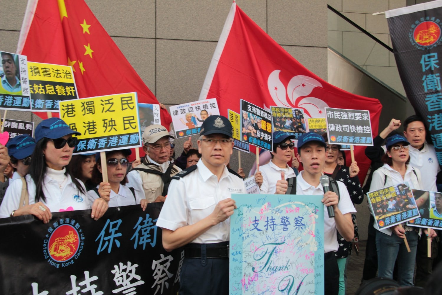 「七警案」判刑后,支持警察的民间团体「保卫香港运动」约50人游行至警察总部,向警方递交感谢卡后,再游行至律政中心,向律政司递交请愿信,要求律政司尽快检控占中发起人,以及积极遏止港独。