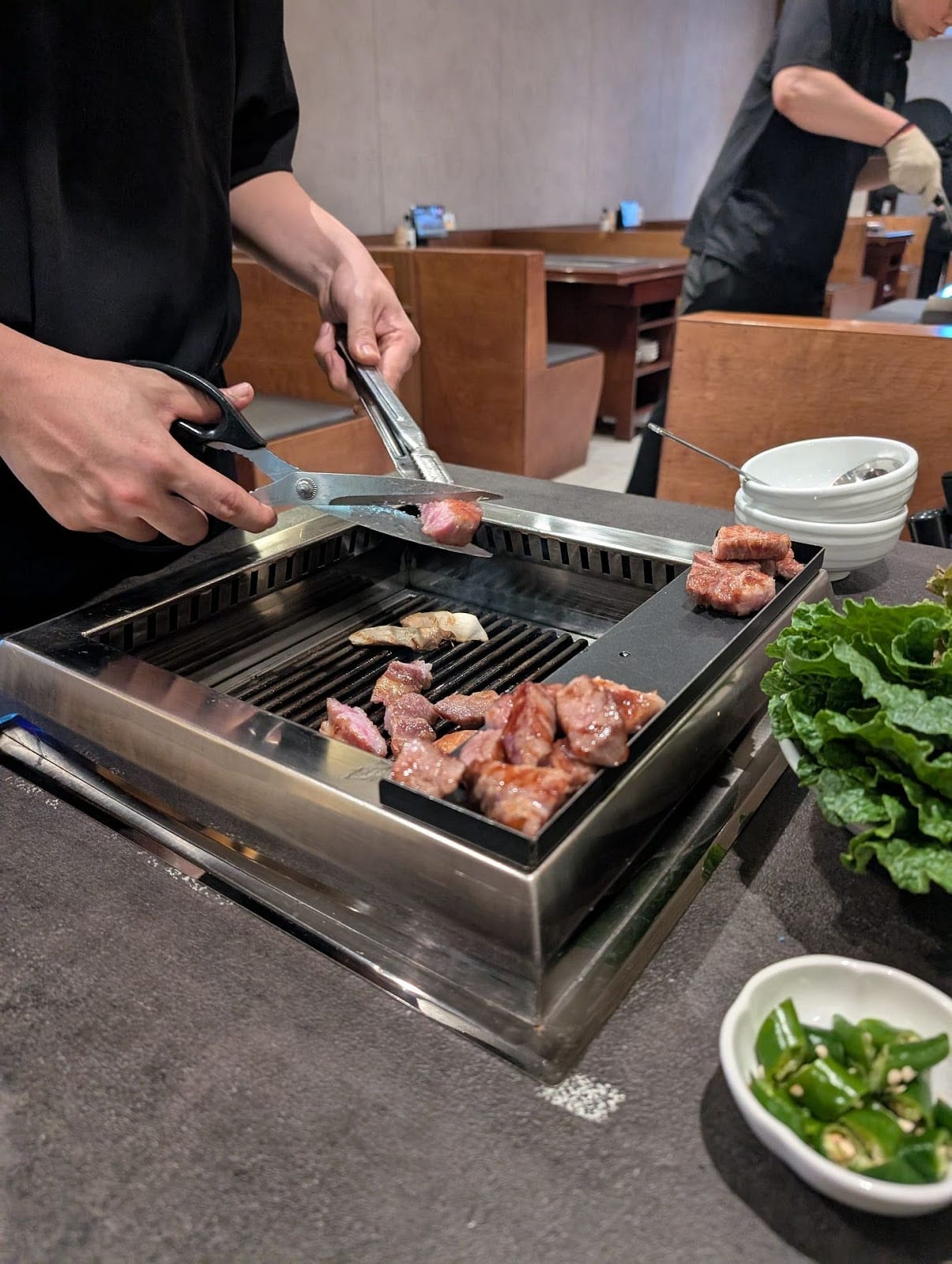One of my favorite dishes was North Korean-style cold noodles 물냉면, which are made of buckwheat and would fall apart if served hot. They come with julienned apples and a boiled egg, and are served in a refreshing broth with a bit of vinegar.