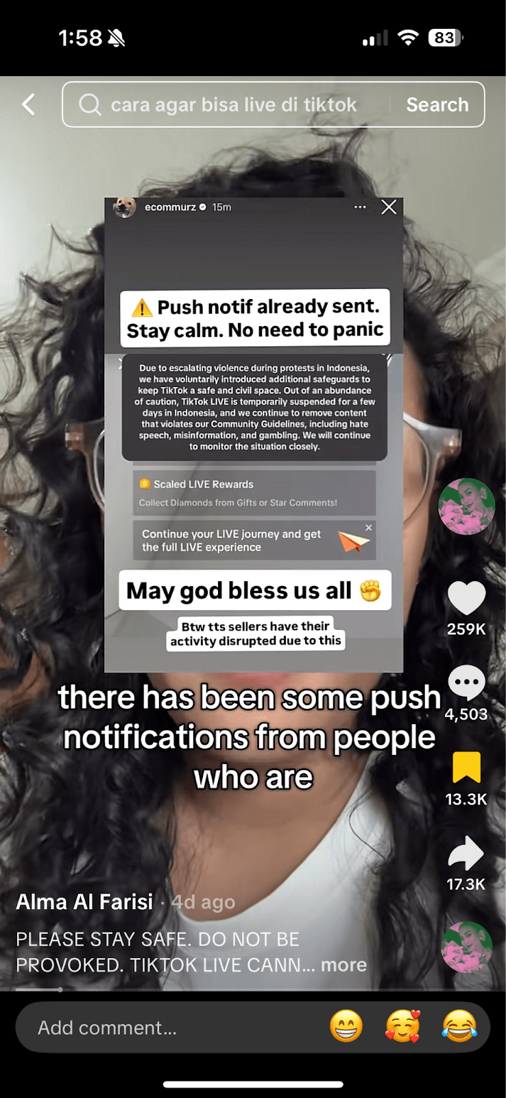 What happens when millions in your platform’s biggest user base start posting videos about political conflict and violence? On August 30, TikTok, along with Instagram, turned off livestreaming in Indonesia and sent this notification to creators in the country:
