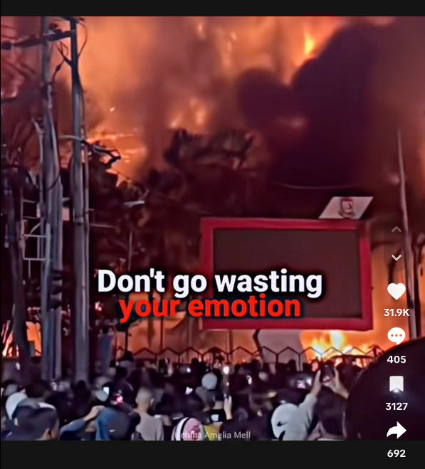 Indonesian TikTokers are still trying their best to televise the revolution without livestreams. They’re calling on international users to comment using viral words like “labubu dubai chocolate” on their videos discussing Indonesian politics, so as to fight alleged algorithmic suppression of anti-government content. They are also making very creative edits out of protest footage to fill hashtags like #demodpr (“demo” is Indonesian slang for protest, and DPR is the acronym for the Indonesian House of Representatives, the target of much ire), #indonesiagelap (“gelap” means dark), and #resetindonesia: