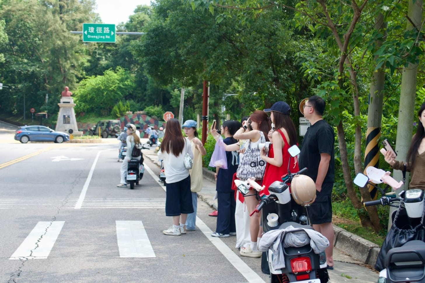 Finding the Chinese tourists in Taiwan-controlled Kinmen is easy: just follow the electric scooters. They accelerate no faster than 25 kilometers per hour, tutting leisurely along Kinmen’s cross-island roads. You can see them gathered in dense clusters outside Poya and Cosmed — favorite shopping destinations for cosmetics and skincare among Chinese tourists — or parked nearby popular spots for social media photoshoots (known on Chinese social media as “check-in points” or 打卡点). That’s where I met Mike, Jenny, and Juan-juan, three twenty-something Fujianese among a crowd of many lined up at the side of the road to snap a picture in front of an aesthetically pleasing bus stop.