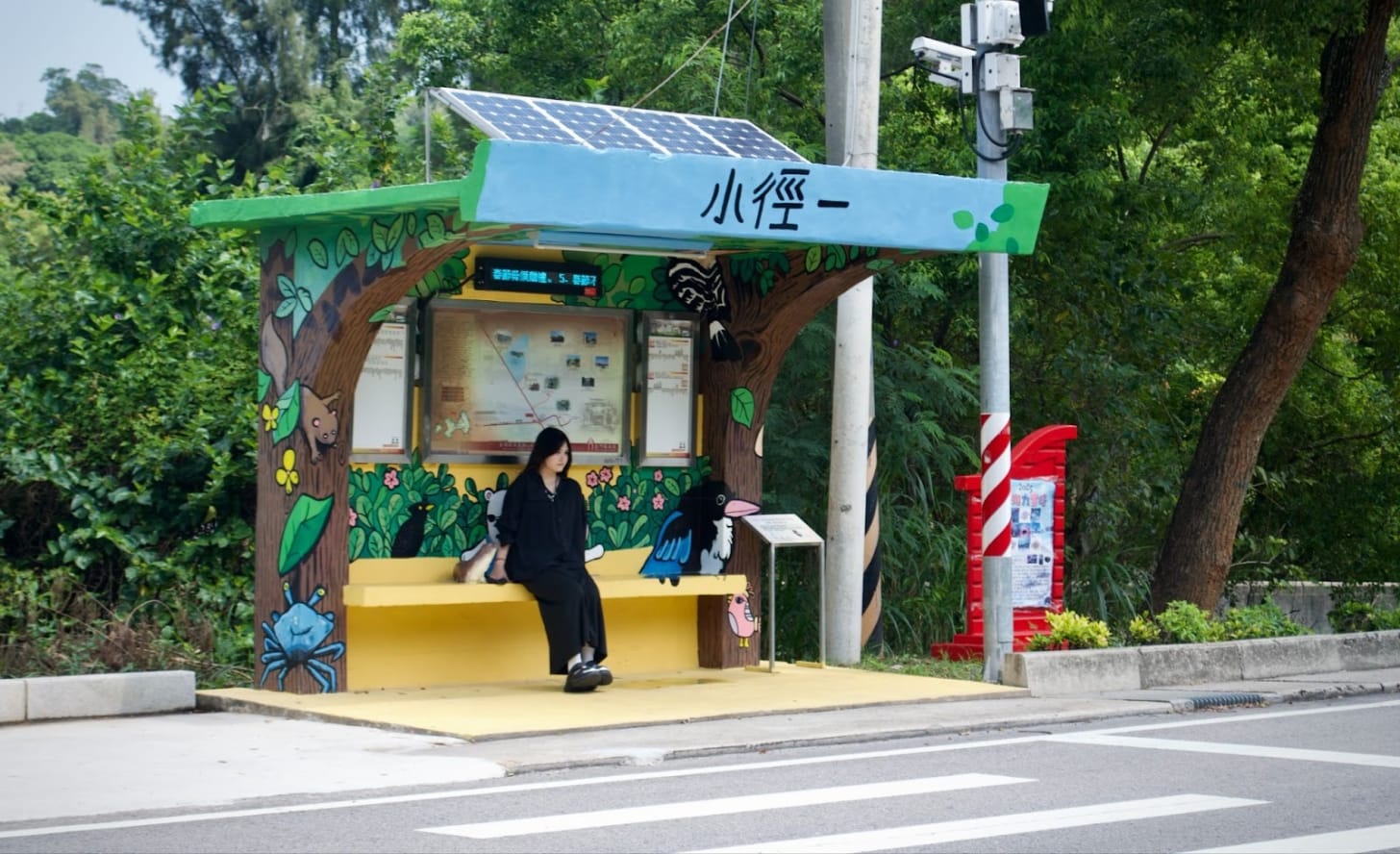 Chinese tourists posing at a bus stop in Kinmen. Jordyn Haime for ChinaTalk.