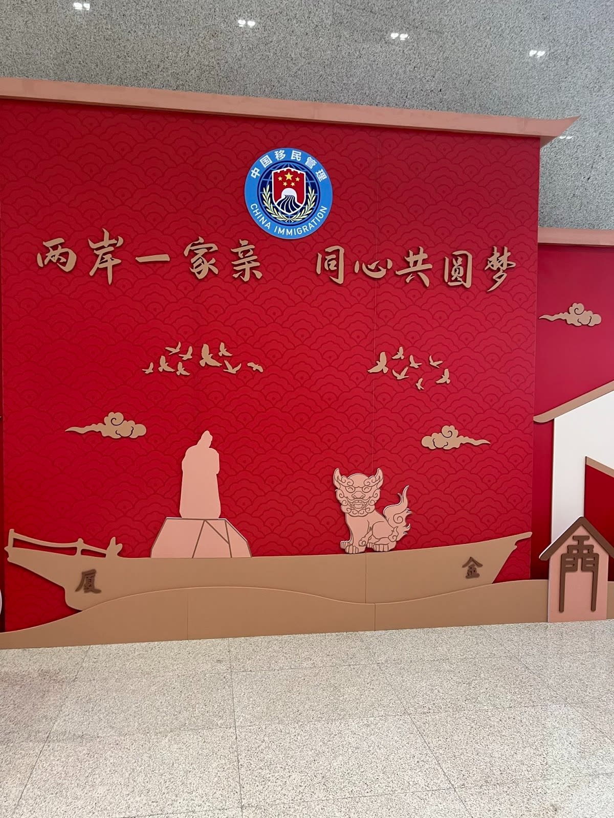 Left: “Cross-strait harmony, happy Kinmen” sign at the Kinmen Shuitou ferry port. Right: “The two sides of the strait are one family, working together toward a common dream,” seen at the Xiamen Wutong ferry port. Photos courtesy of Ari Fahimi.