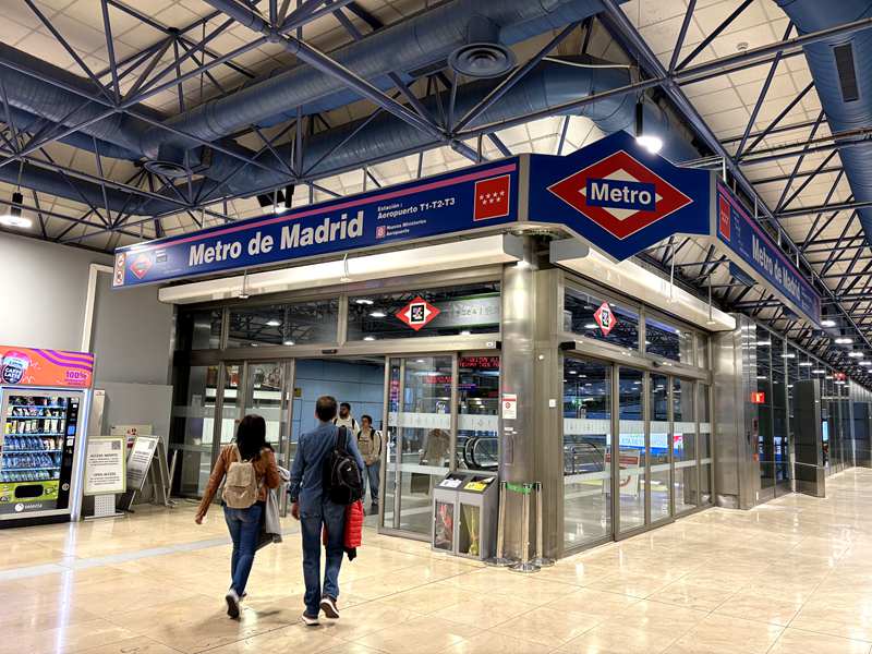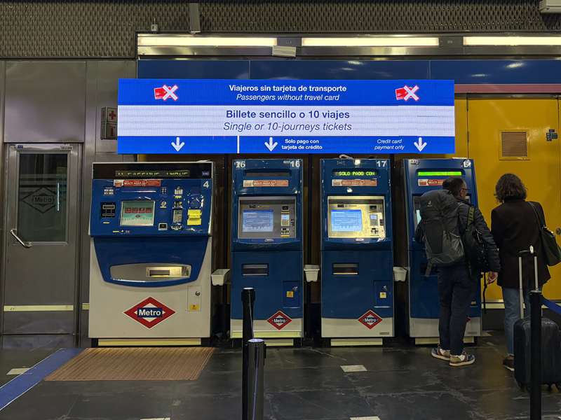 在马德里巴拉哈斯机场地铁站找到售卖公交10次卡的机器,选择英语,输入目的地(比如Nuevos Ministerios),选择10次卡,售价9.8欧元(10次公交费7.3欧元+卡费2.5欧元),从机场乘坐地铁需要额外3欧元机场费,共计12.8欧元。