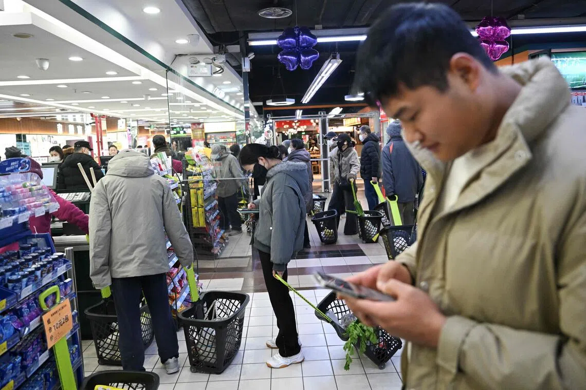 中国将强化商务与金融系统协作,更大力度提振消费。图为12月10日,顾客在北京一家超市排队付款。 (法新社)