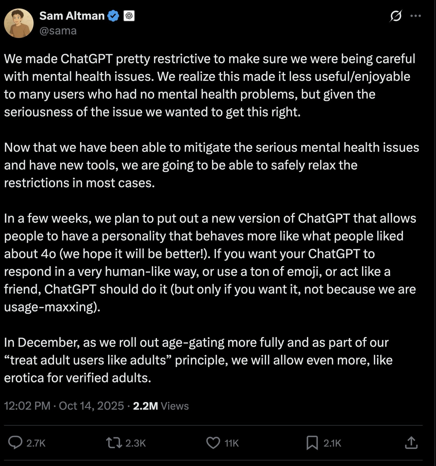 Western companies have fewer compulsions around sexing up their products. We’ve seen Elon’s X.AI ship a sexualized AI girlfriend. While OpenAI is turning down dials on dependency after the recent spate of suicide reporting, OpenAI’s February 2025 model card update did not prohibit sexualized content for all use cases besides sexualizing minors. The two heaviest global hitters in the NSFW AI companion space are American with Janitor.AI at 100m MAU Canadian with SpicyChat.ai at 50m.
