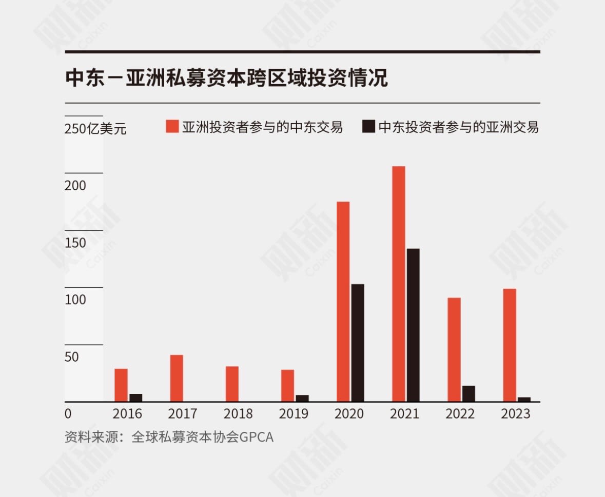 Caixin: “Cross-regional investment of private equity in the Middle East and Asia”; red = “Middle East deals involving Asian investors”; black = “Asian deals involving Middle Eastern investors”; 100亿美元 = US$10 billion