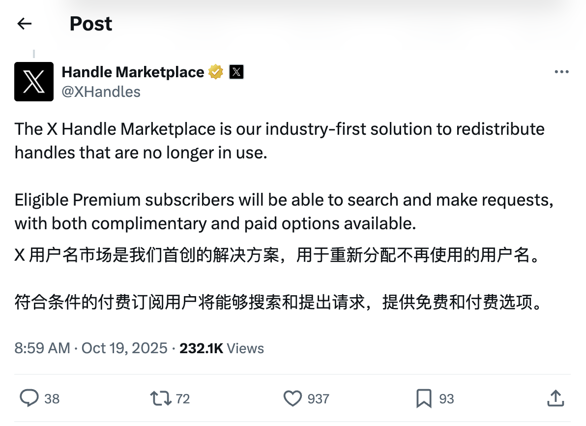 X 推出闲置用户名市场:稀有用户名最高或将要价数百万美元