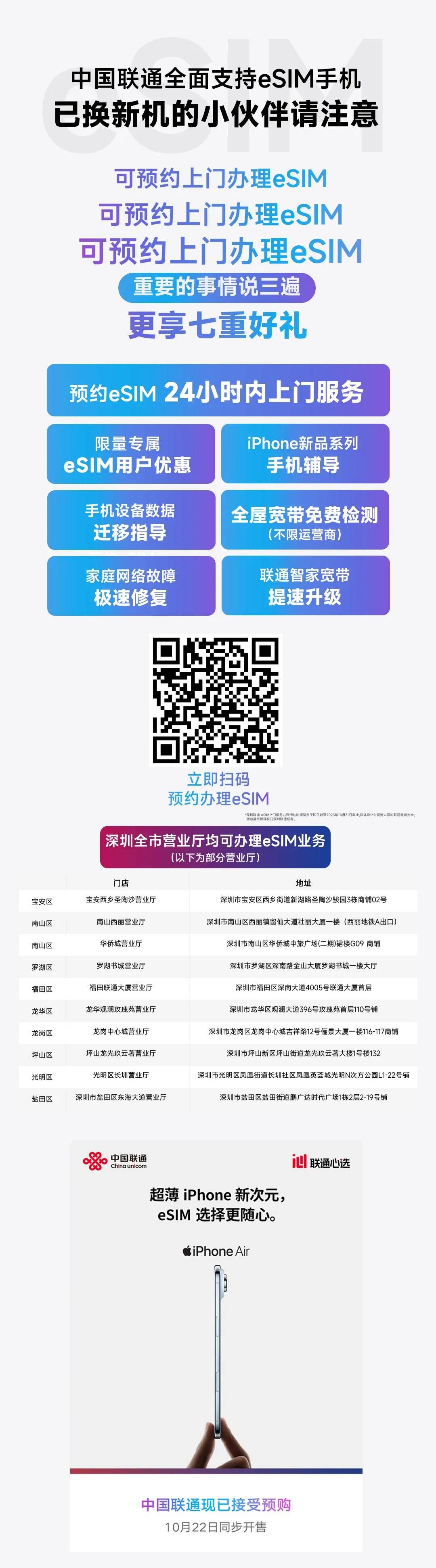 昨天,深圳联通宣布推出「eSIM 上门办理」服务,用户可通过官方渠道预约,享受最快 24 小时内的上门支持。此次服务覆盖深圳全市,联通营业厅亦同步开放 eSIM 业务办理。