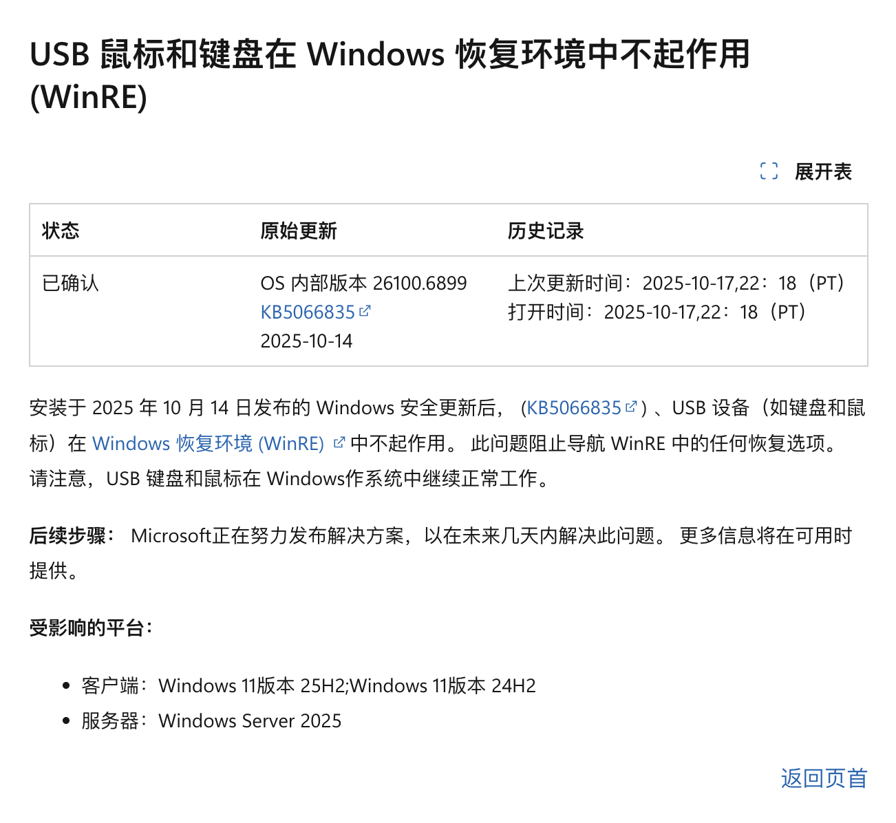 微软同时提醒用户,系统在正常运行状态下 USB 外设不受影响,仅在进入恢复环境时会出现失灵现象。官方承诺将尽快发布补丁修复该问题,并在后续公告中提供更多信息。