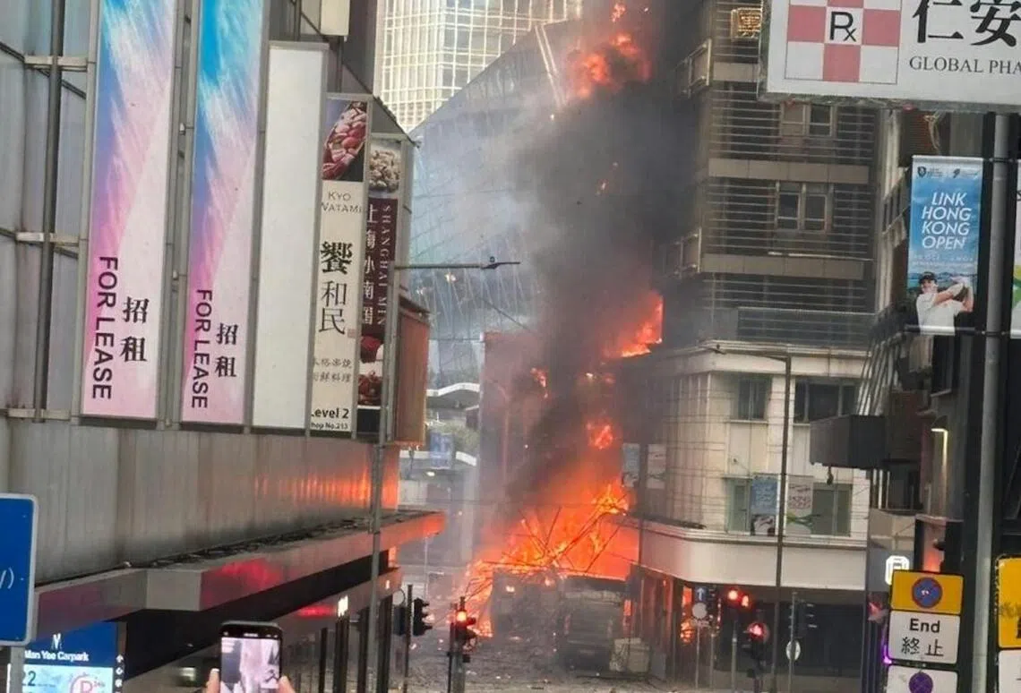 综合网媒“香港01”和《星岛日报》报道,星期六(10月18日)下午4时许,香港警方接获多个报案,指中环干诺道中华懋大厦后巷有鹰架发生大火,浓烟直冲半空,现场一度传出爆炸声。网络视频和图片显示,火势非常猛烈,黑烟冲天,远至九龙可见。