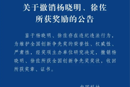 近日,中国科协发布《关于撤销杨晓明、徐佐所获奖励的公告》。