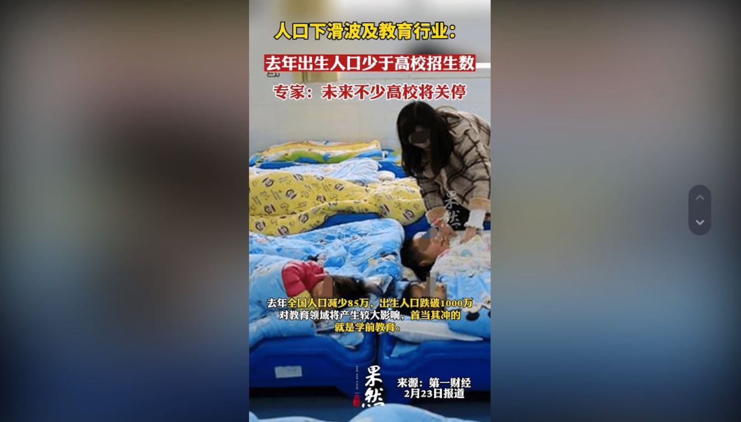 中国近期公布了2022年出生人口为956万的官方数据,而根据中国教育部《2021年全国教育事业发展统计公报》,中国普通本科招生444.6万人、职业本科招生4.14万人、高职(专科)招生552.58万人,合计1001.32万。这意味着,中国出生人口实际上已经低于高校招生人数。