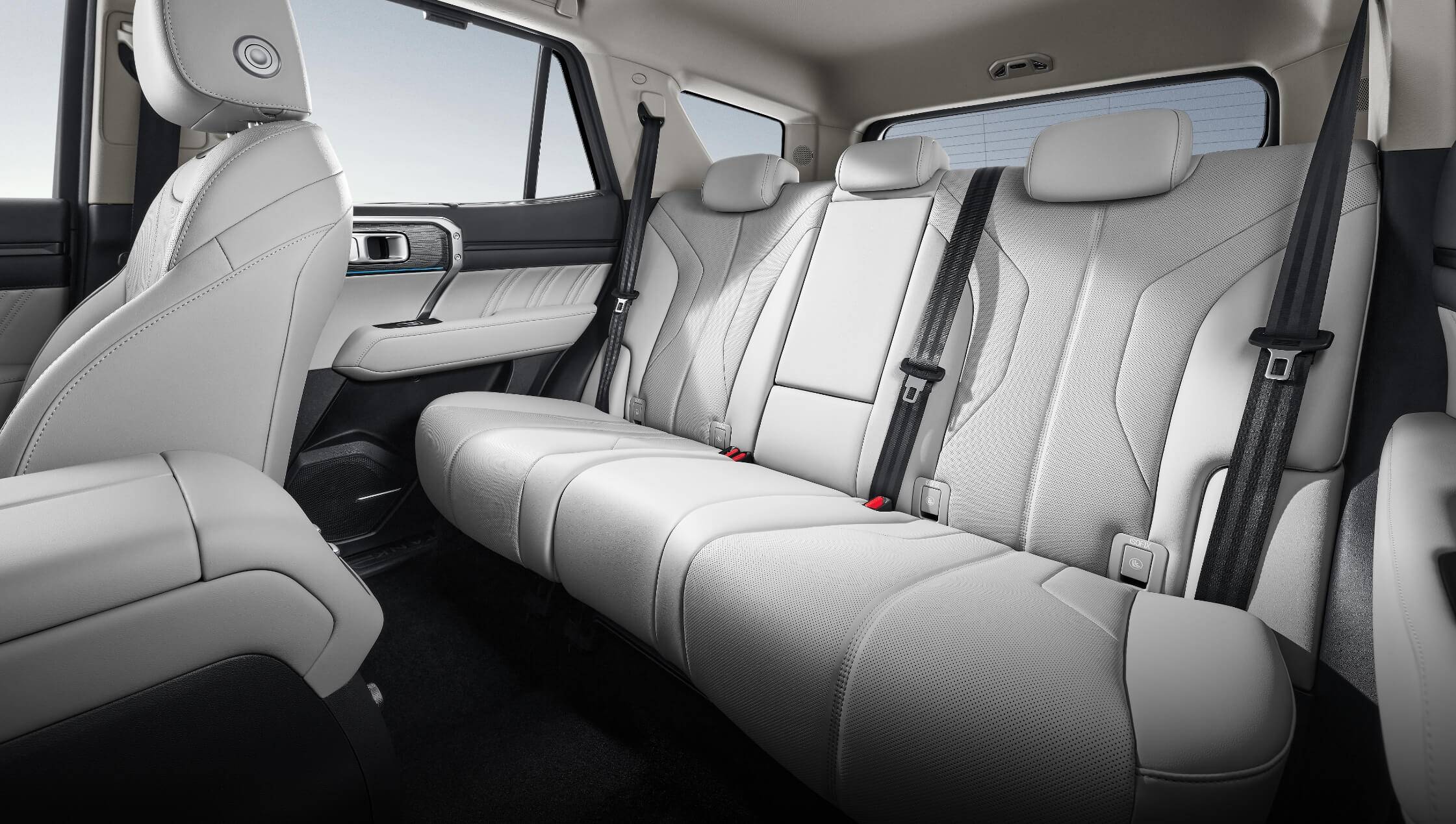 X9 提供四种座椅布局模式。七座状态下,三排均拥有超过 1 米的腿部空间,10 岁以下儿童可在车内站立行走;六座模式下,可轻松容纳三个 24 英寸行李箱、一辆轮椅和两台婴儿车;五座时,能装下五个行李箱加两辆儿童自行车;而一键电动收纳第三排后,可形成 2514 升的纯平储物空间——足以放下五辆成人自行车,甚至铺上 1.8×1.6 米的床垫变身露营床。