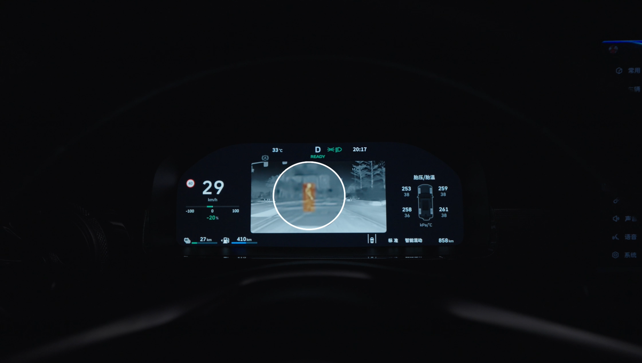 硬件层面,全车共配备 27 个传感器,包括 1 颗激光雷达、2 颗 800 万像素前视摄像头、3 个毫米波雷达,以及多个环视与侧视摄像头。远红外夜视系统探测距离可达 300 米,能在夜间识别 90 米内的行人。