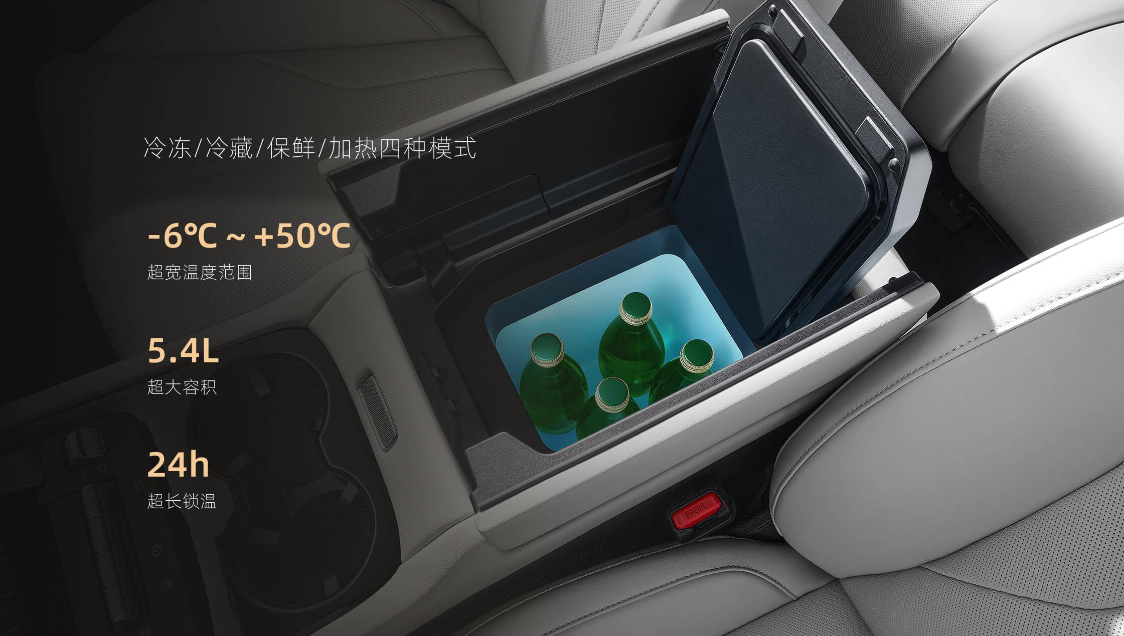车辆前后排之间则增加了一个 5.7L 的中岛冰箱,支持-6℃至 20℃冷藏与 35℃至 50℃保温双模式,可存放饮料、护肤品甚至婴儿辅食。