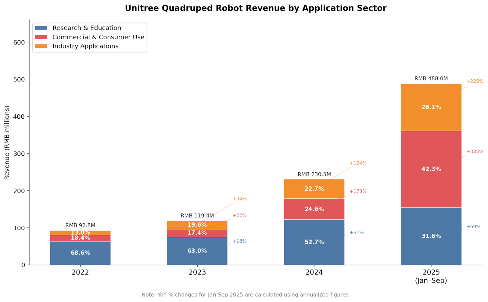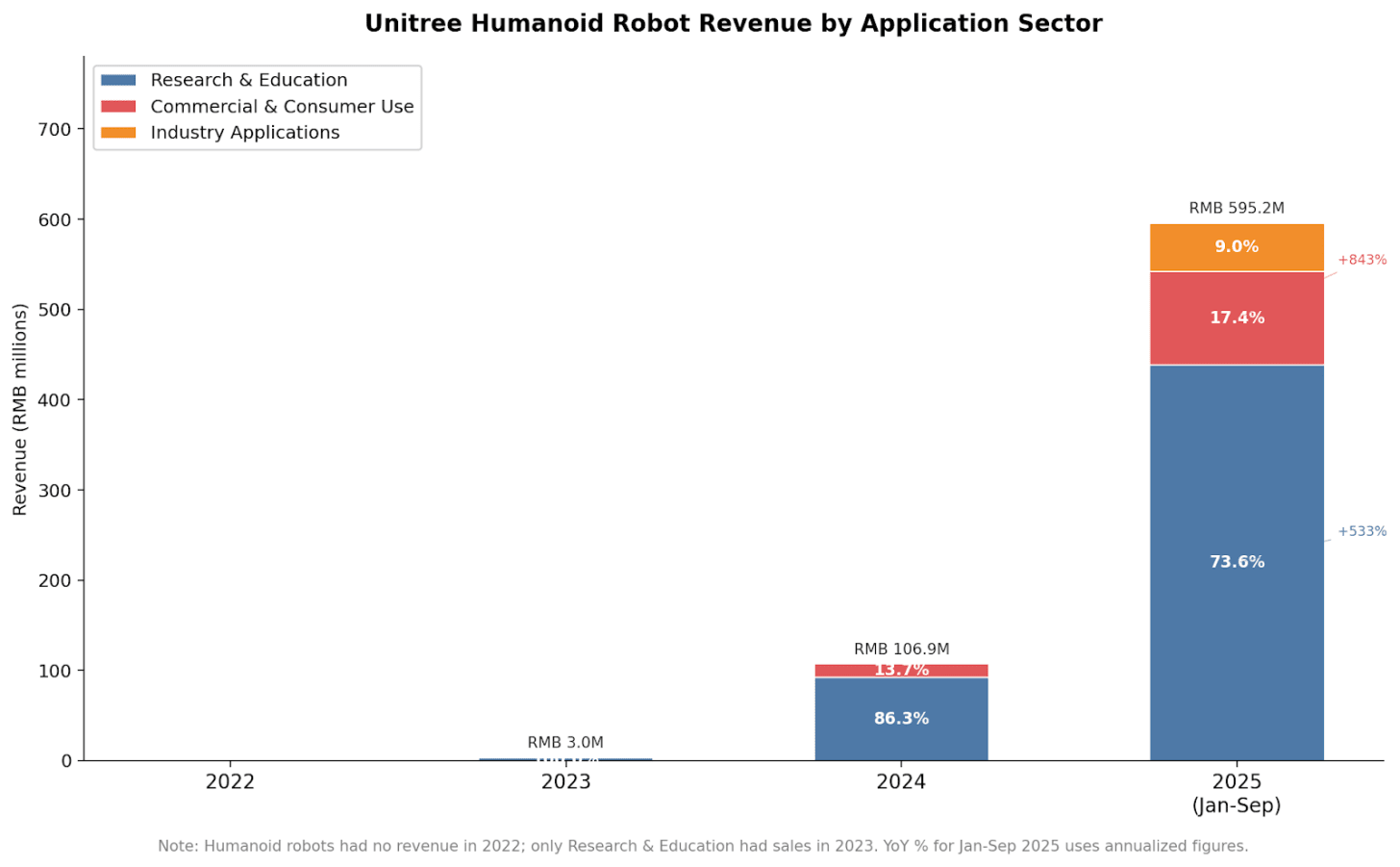 The data Unitree disclosed about its revenue sources, however, paints a more complex picture. For quadrupeds, the research and education sector has been the company’s most reliable source of revenue since at least 2022 (IPOs generally do not require companies to disclose audited financial statements from more than three years ago). But starting in 2024, revenue from both commercial and industry customers more than doubled. Consumer sales revenue nearly quadrupled year-on-year in only the first nine months of 2025.