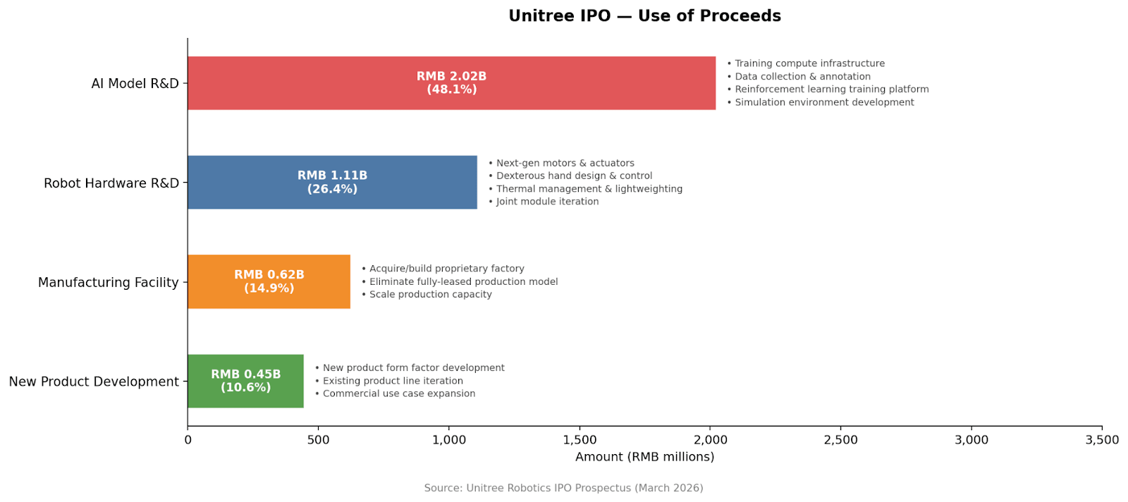 This becomes clearer when we look at Unitree’s plan for using the 4.2 billion RMB (around 607.7 million USD) raised through the IPO. Unitree’s stakeholders approved the following distribution in early 2026: