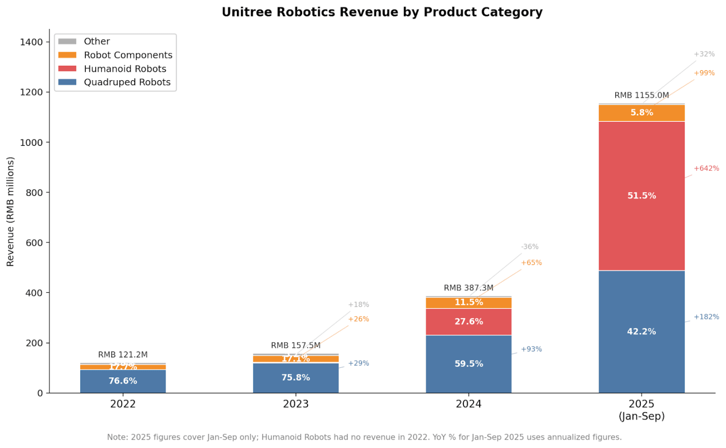 This context is why observers have found Unitree’s ability to turn a profit remarkable. Not only has the company’s net profit been positive since 2024, but from 2024 to 2025, its net profit grew by 204.29%. A look at its growth, broken down by product category, reveals the most significant source of this revenue explosion: humanoids.
