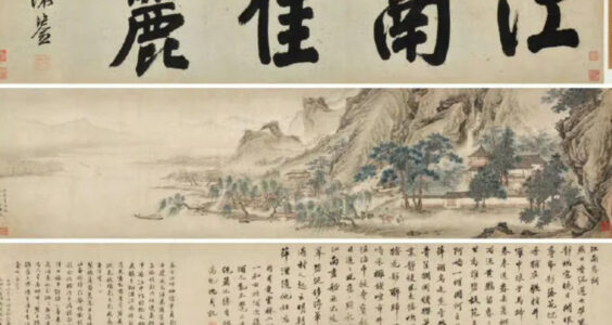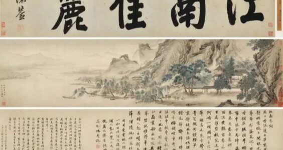 《江南春》图卷本身包括三大部分,即卷首陈鎏所题“江南佳丽”四字、卷中署名仇英的《江南春》图,以及卷尾众多文人唱和元代书画家倪瓒《江南春》词的题跋。按汤哲明的意见,虚斋旧藏《江南春》图卷,卷首陈鎏题字为真,仇英画作为真,卷尾的题跋一半是假的,另一半的真伪还需要考证。按颜明的意见,仇英画作为假,卷尾的题跋全假,只有卷首陈鎏题字可能为真,但也值得怀疑。尽管汤、颜两位专家观点不完全一致,但足以让认真看过他们文章的人意识到,对于《江南春》图卷这样的长卷,绝不能采取“要么全真、要么全假”的二极管思维。